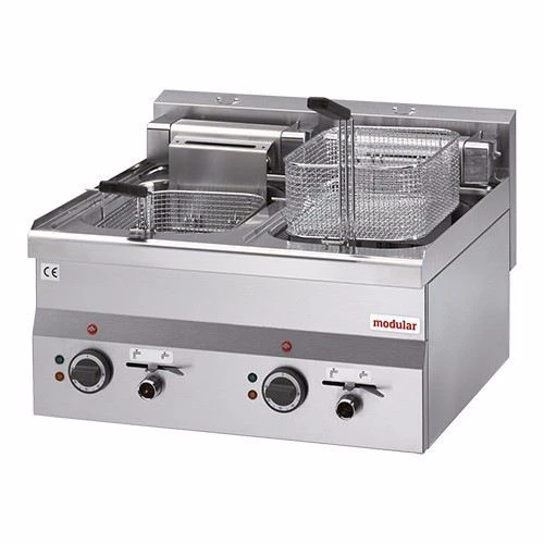 Dit model heeft een geperste frituurbak met afgeronde hoeken en ingebouwde aftapkraan met afvoerpijp per pan, de friteuse is thermostatisch instelbaar tot 190°C en beschikt o.a. over een koude zone en kruimelvanger.