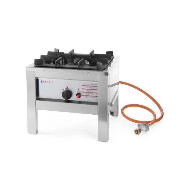 Volledig roestvast stalen frame. Uitgerust met thermokoppel en elektronische ontsteking. Voorzien van Geëmailleerde braadpan pandrager.