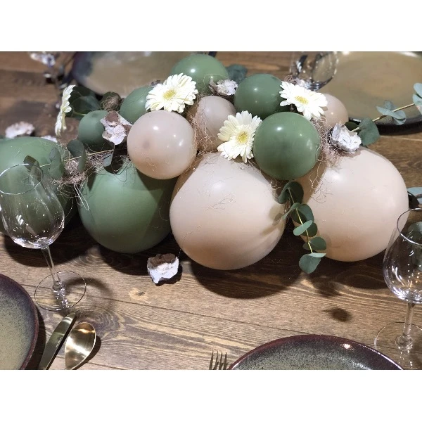 De ballonnen worden wel afgewerkt met de andere versiering en eucalyptustakken.